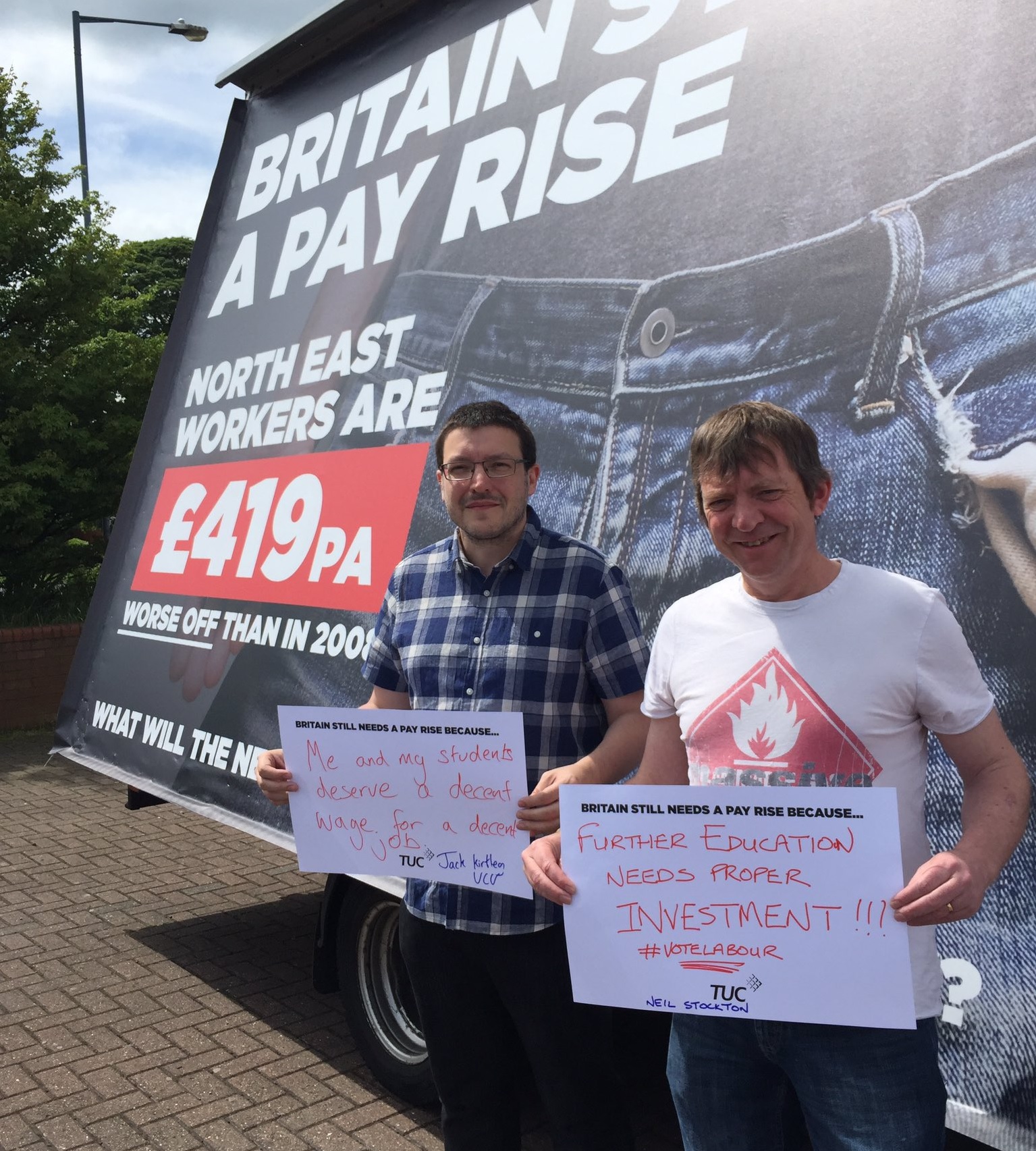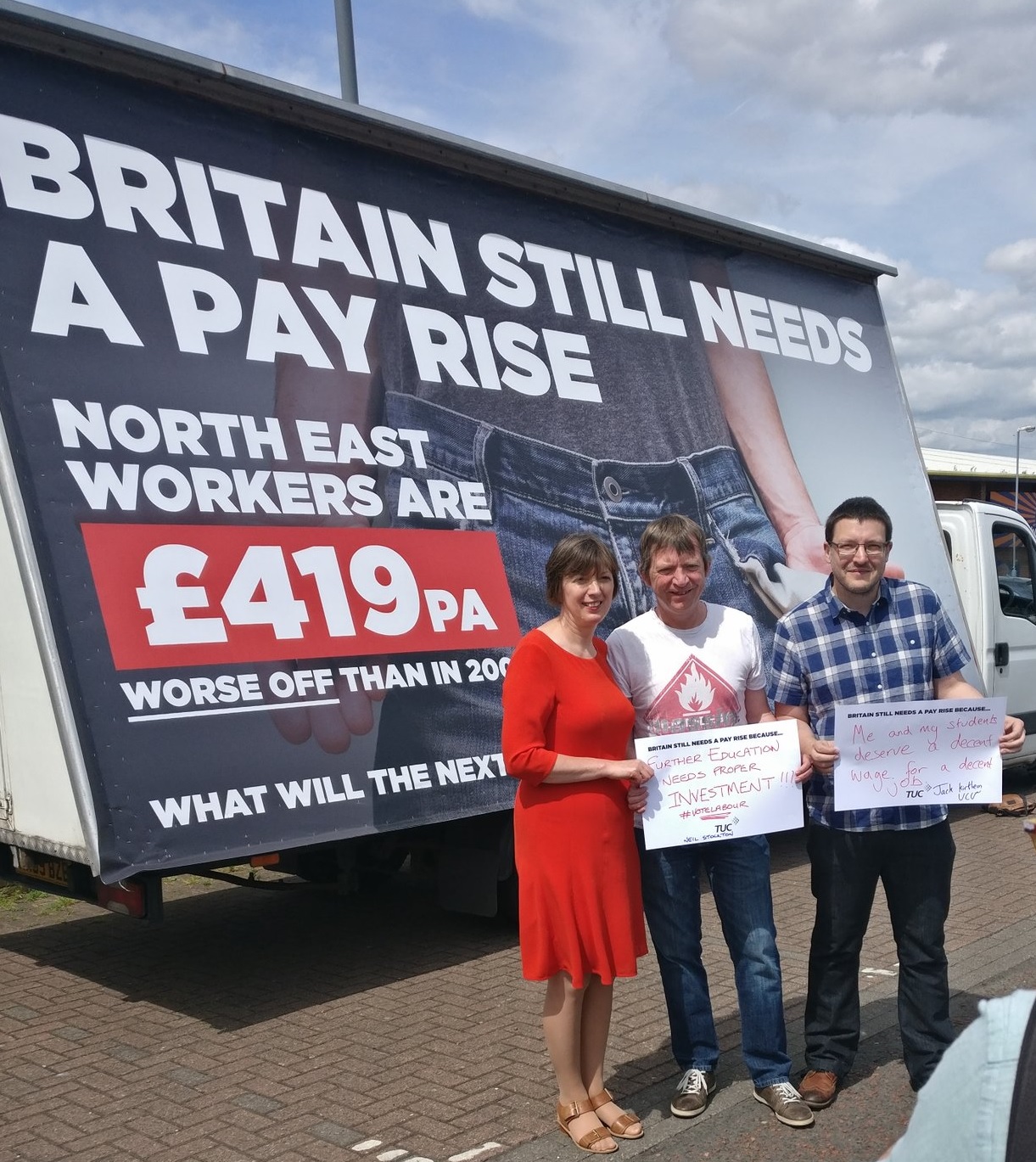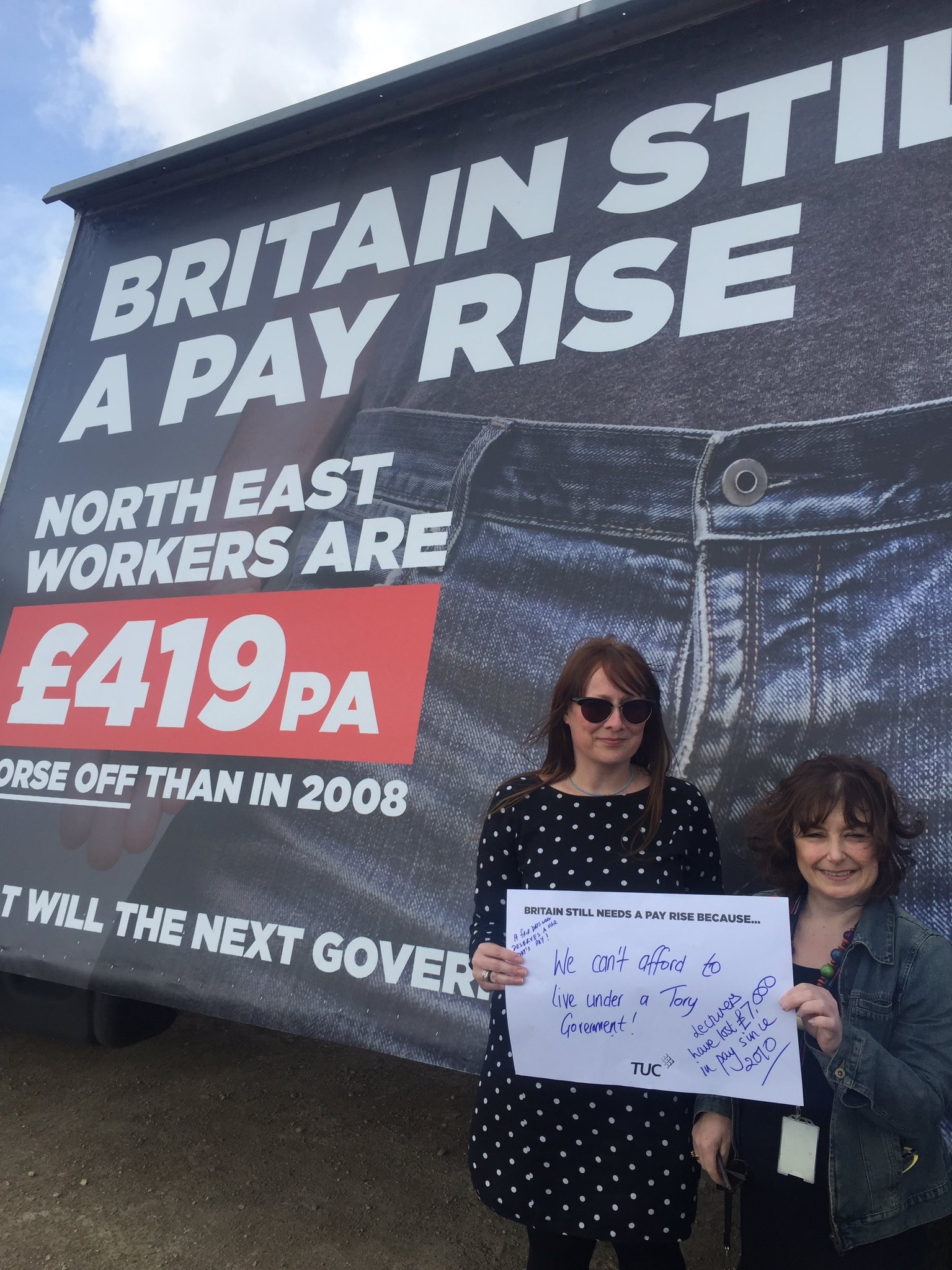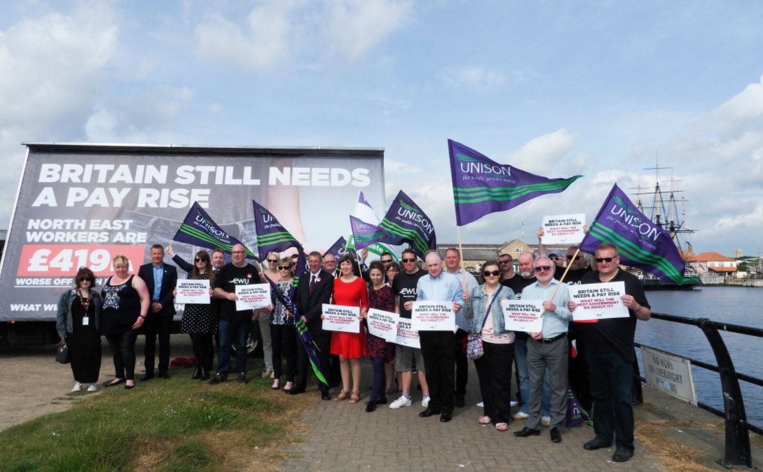The TUC General Secretary Frances O’Grady launched a poster campaign in several North East constituencies on 1st June calling on all parties to “give Britain a pay rise”.